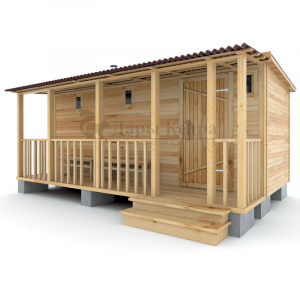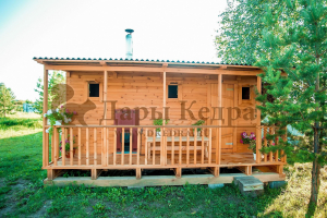 Это классическая прямоугольная модель бани с тремя отделениями: предбанником, моечной и парилкой. Для удобства пользования предбанник оснащен лавочкой и вешалкой. В моечной находится лавка и полочка из кедра. Парилка оборудована двухуровневым открытым полком и печью. Время растопки такой бани не превышает 30 минут. На просторной веранде можно оставить вещи или отдохнуть после парения. Каркасно-щитовую баню можно заказать как в готовом, так и в разборном варианте. В разборной модели готовые щиты из кедра быстро собираются в полноценное строение, что также позволяет исключить лишний строительный мусор. Такая баня не требует полноценный фундамент, поэтому при необходимости ее можно перенести в другое место.